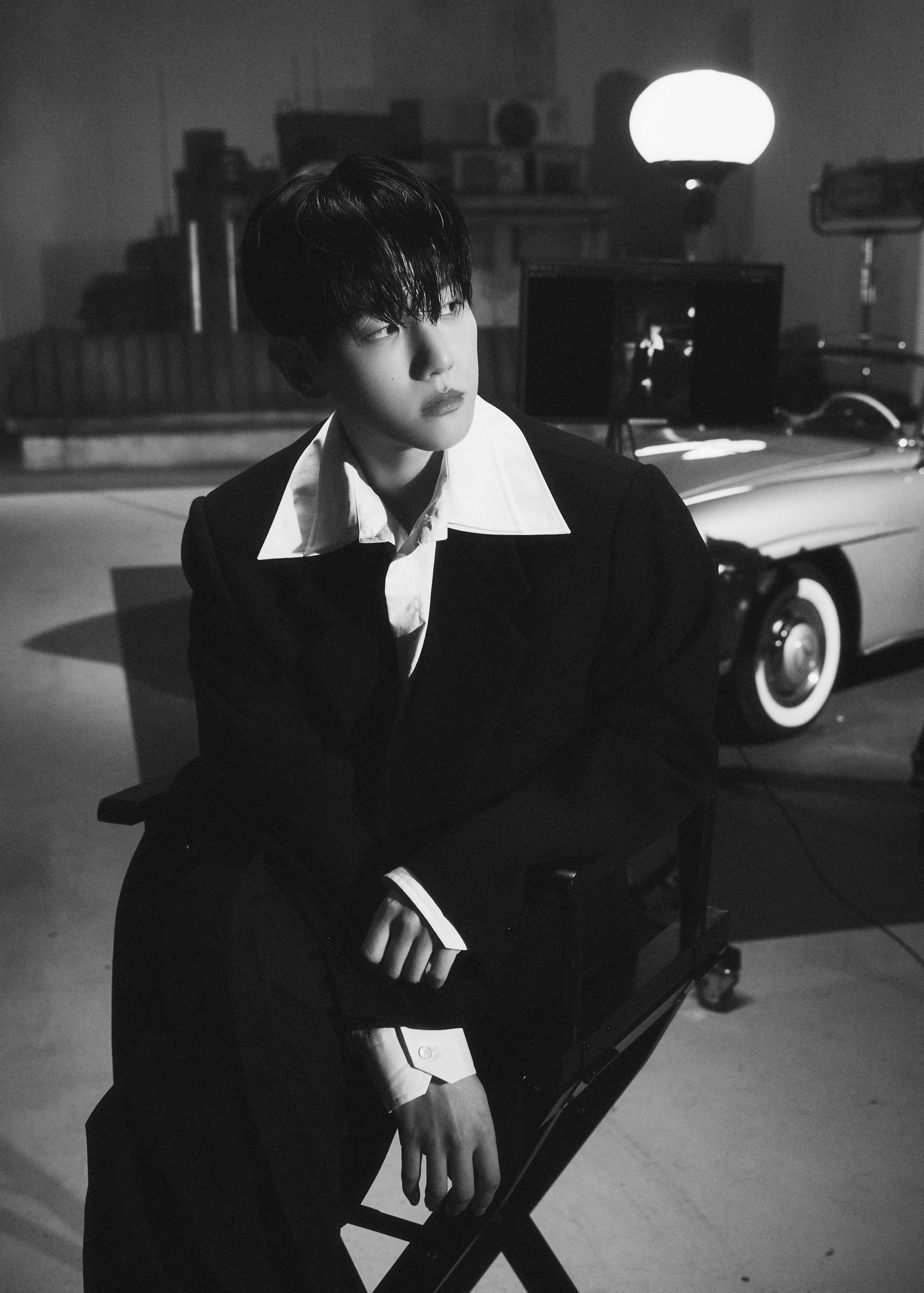 It was reminiscent of a movie set. Baekhyun appeared in a studio filled with filming equipment. He wore a black suit and made a mysterious expression toward the camera.