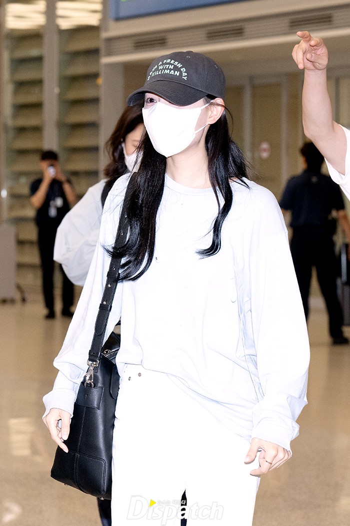 Kim Ji-won showcased a lovely airport fashion with white pants and a blue shirt, highlighting her pure beauty.