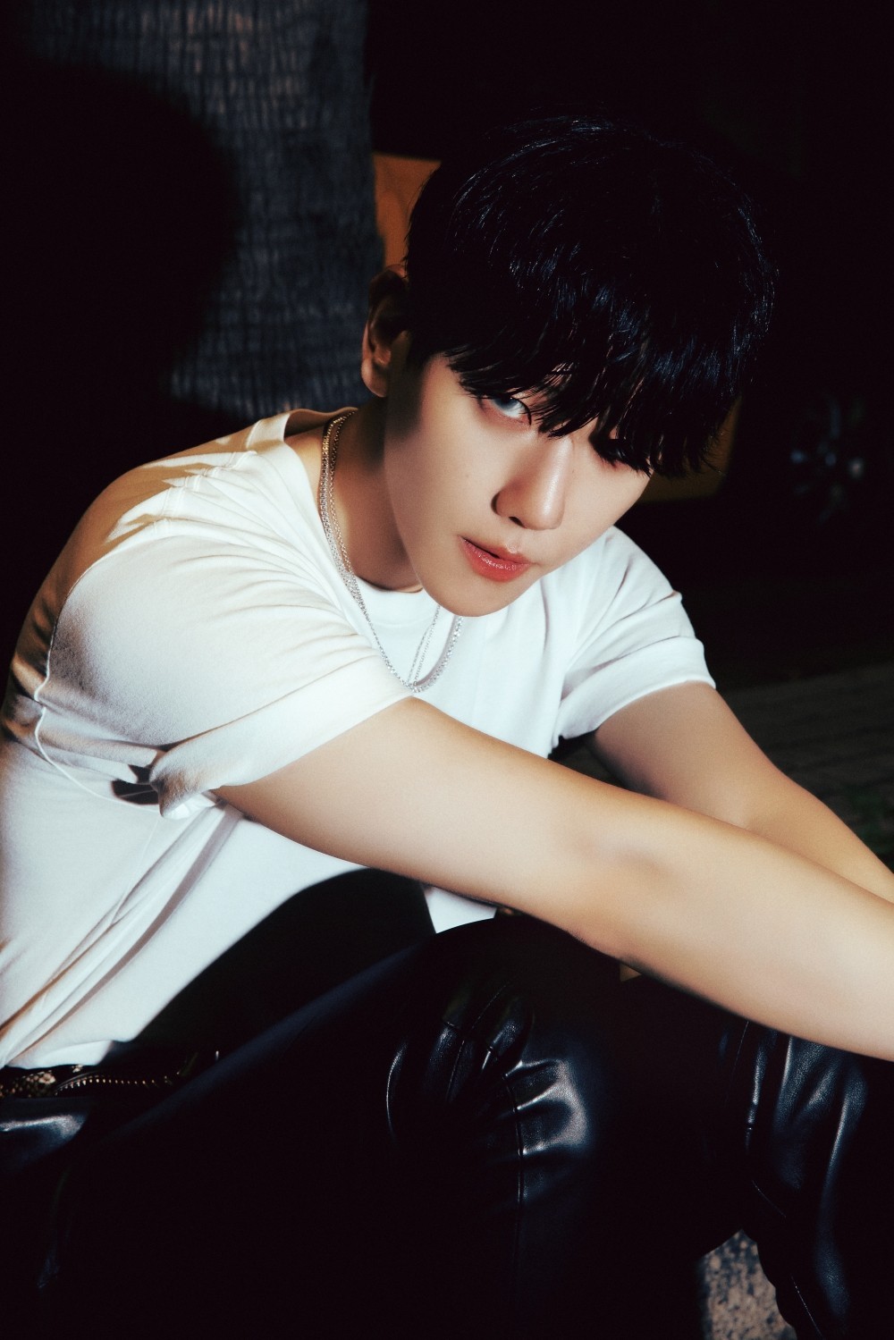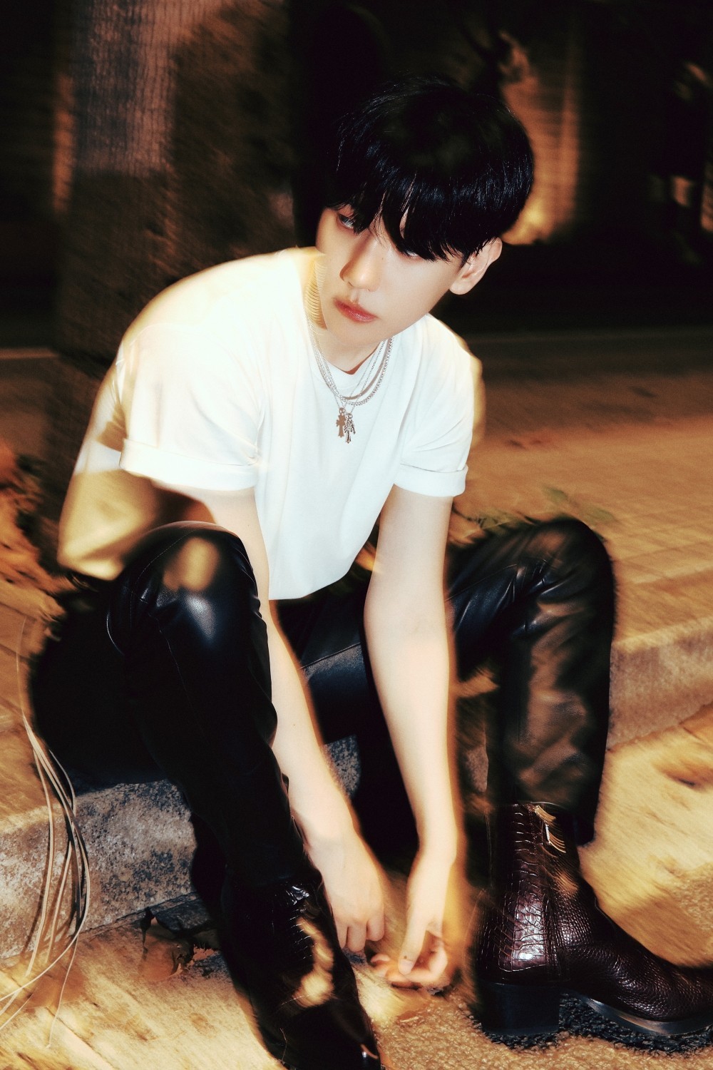 In the photos, Baekhyun exudes a mysterious aura. He looks at the camera with captivating eyes. He also perfectly pulls off trendy looks such as leather boots, leather pants, and a white T-shirt.