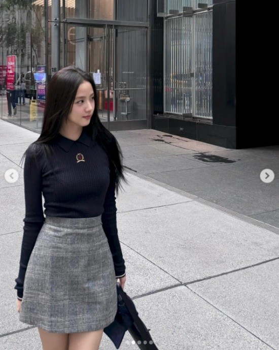 In the photo, Jisoo, who traveled to New York City, is seen posing in a navy top and checkered skirt on the streets of New York.