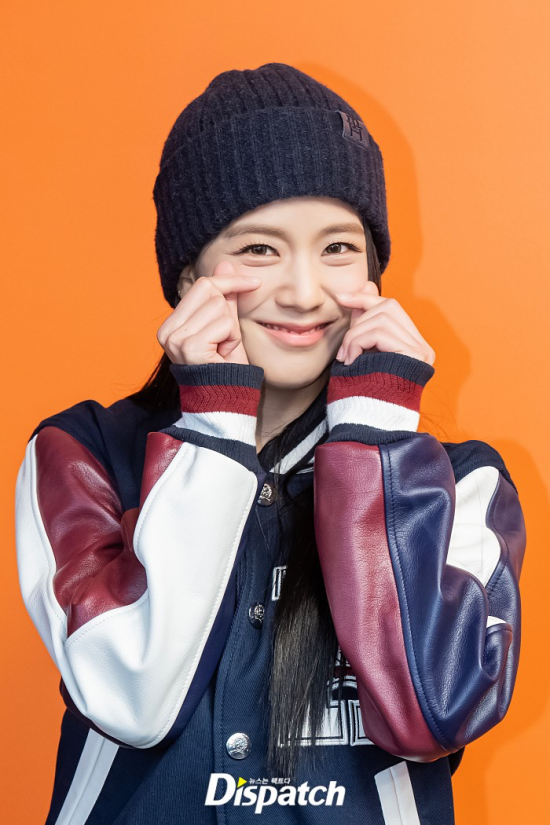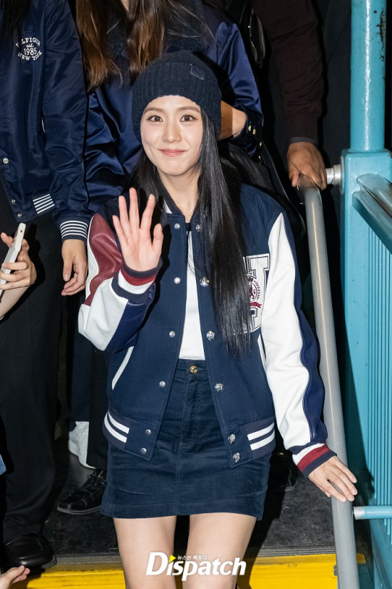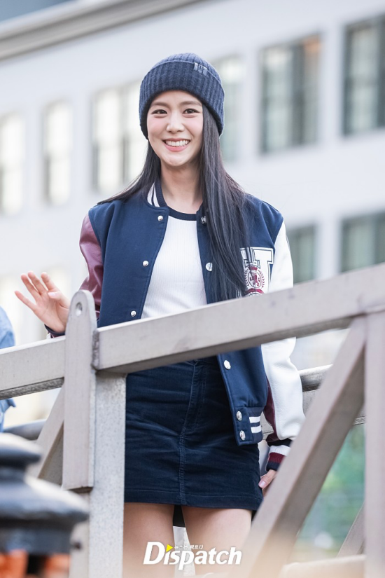 Her cute charm attracted attention. She wore a navy and burgundy varsity jacket, a mini skirt, and a beanie to complete her casual look. She showed off her charm with a bright smile and a friendly greeting.