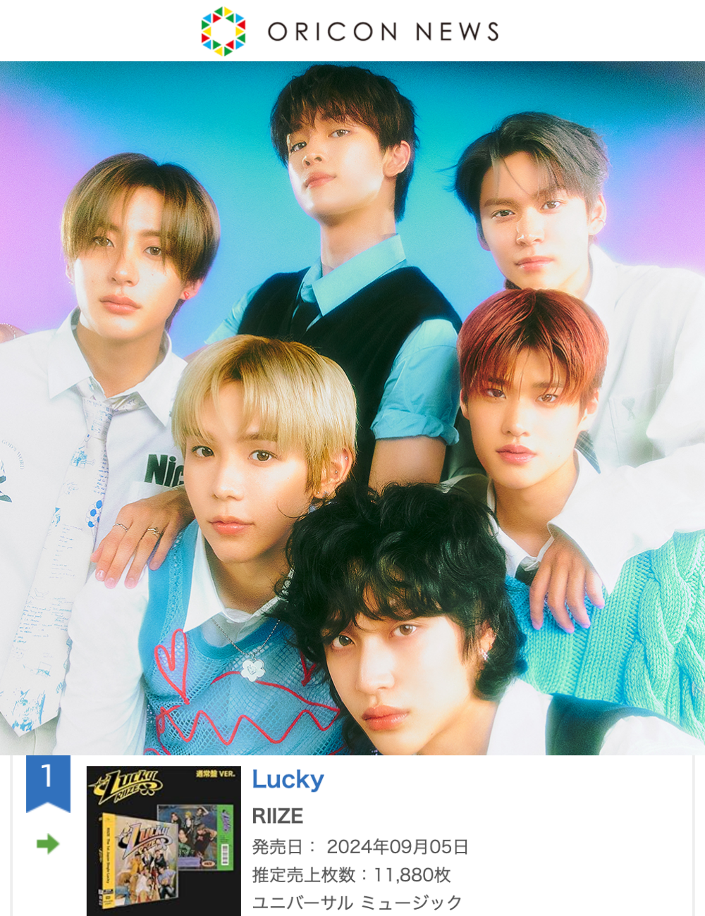 Riize released their first Japanese single, "Lucky," on the 5th. It ranked 1st on the Oricon Weekly Single Chart and Billboard Japan Top Single Sales Chart for the week (both counted from September 2 to 8).