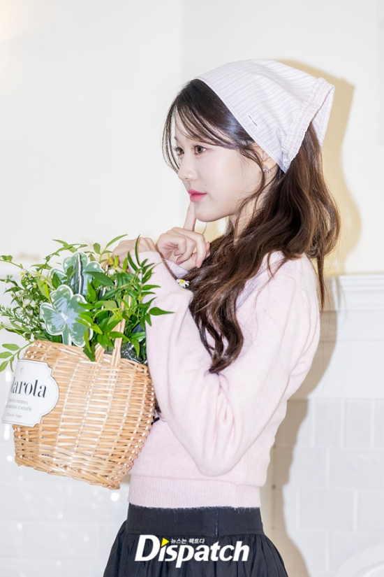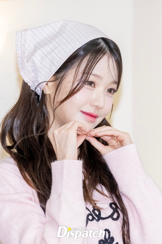 Jang Won Young wore a pink sweater and a black skirt to complete her feminine look. She styled her outfit with a scarf.