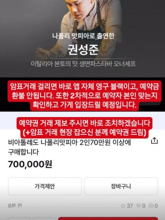 Chef Kwon Seong-joon posted a post on his Instagram story on the 10th, saying, “If you are caught, the app itself will be permanently blacked out and the reservation deposit will not be refunded.” “Also, we will secondarily check if you are who you say you are and enter the restaurant,” he wrote.