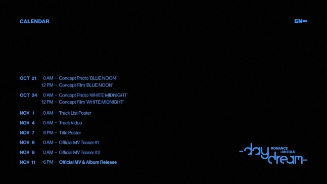 From October 20 to 24, ENHYPEN will unveil concept photos for the 'Blue Moon' and 'White Midnight' versions. From November 1 to 4, they plan to release tracklist posters and track videos, providing spoilers for the album.