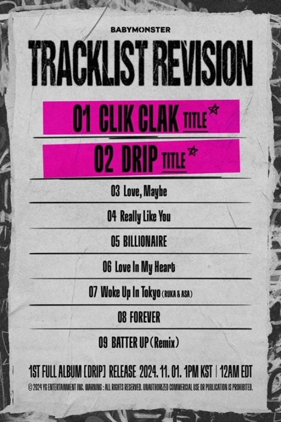 On October 21, YG Entertainment posted a "[DRIP] TRACKLIST REVISION" on its official blog. According to the update, BABYMONSTER will now promote two title tracks: "DRIP," which was previously confirmed, and "CLIK CLAK," the album's first track. This decision reflects the group's intent to make a powerful impact with their debut album.
