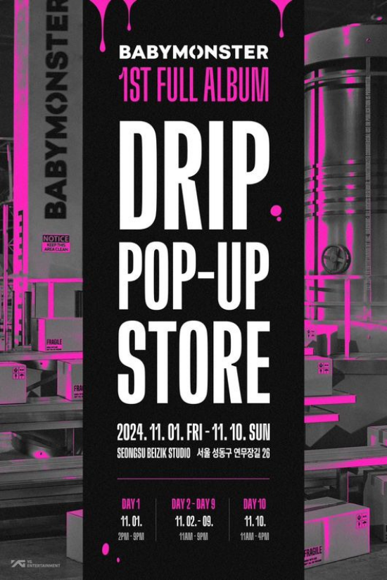 On October 22, YG Entertainment announced that from November 1 to 10, a 'BABYMONSTER 1st FULL ALBUM [DRIP] POP-UP STORE' will be open at BEIZIK STUDIO in Seongdong-gu, Seoul.