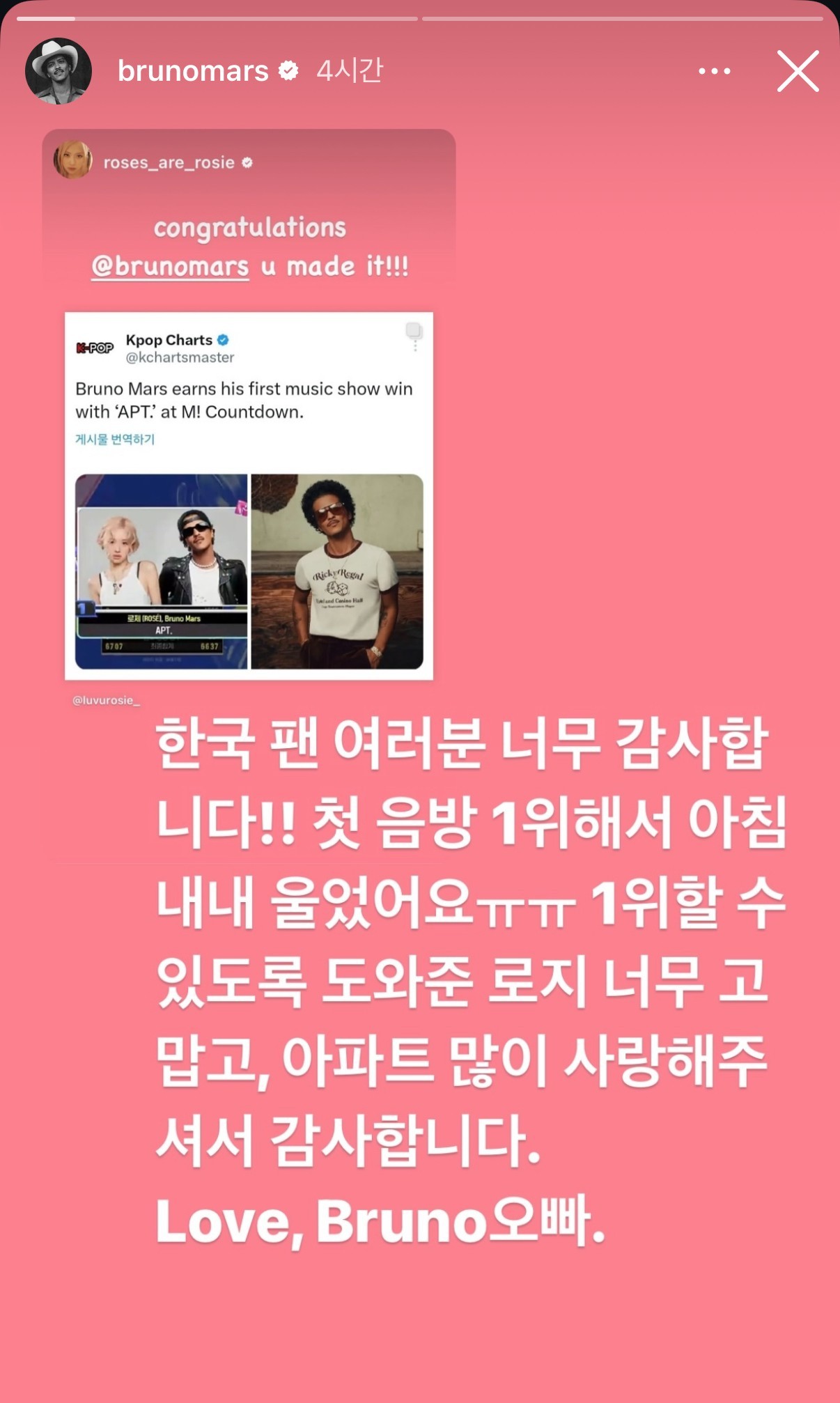 Pop star Bruno Mars achieved first place on a music show with his duet “APT.” in collaboration with BLACKPINK's Rosé, leaving a heartfelt message in Korean.