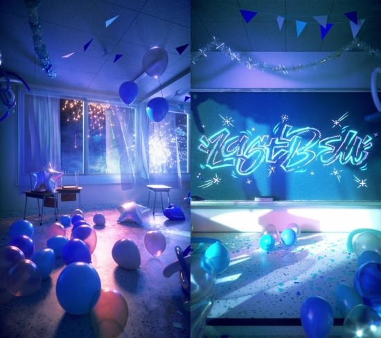 A logo motion video was also released, showing a classroom at dusk, scattered with balloons and confetti, contrasting with the fireworks outside the windows.
