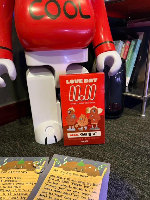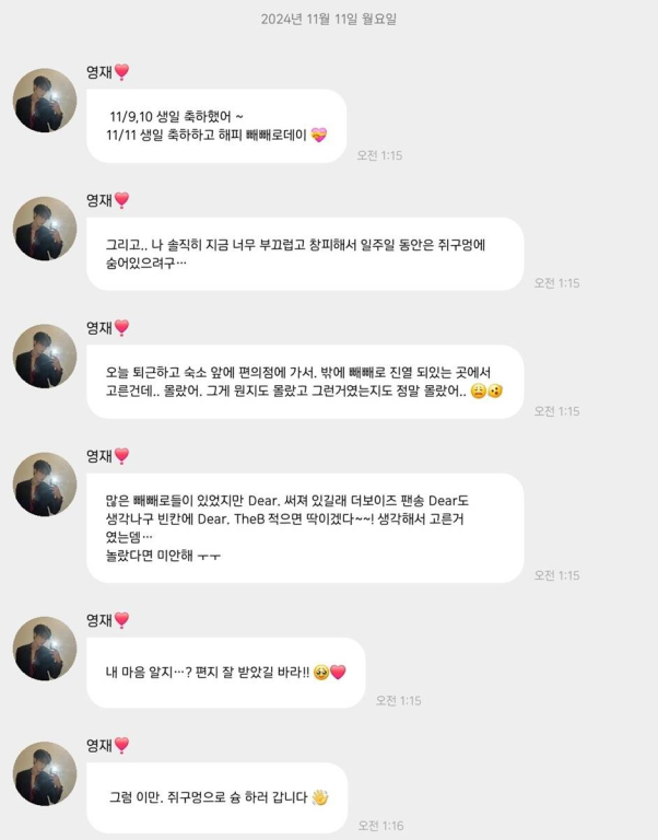 He added, “There were many types of Pepero, but I picked one labeled ‘Dear’—thinking of our fan song ‘Dear’ and wanting to write ‘Dear. TheB’ for our fans. If it shocked you, I’m sorry.” He closed on a light note, saying, “I hope you got my letter. Now, I’m off to hide.”