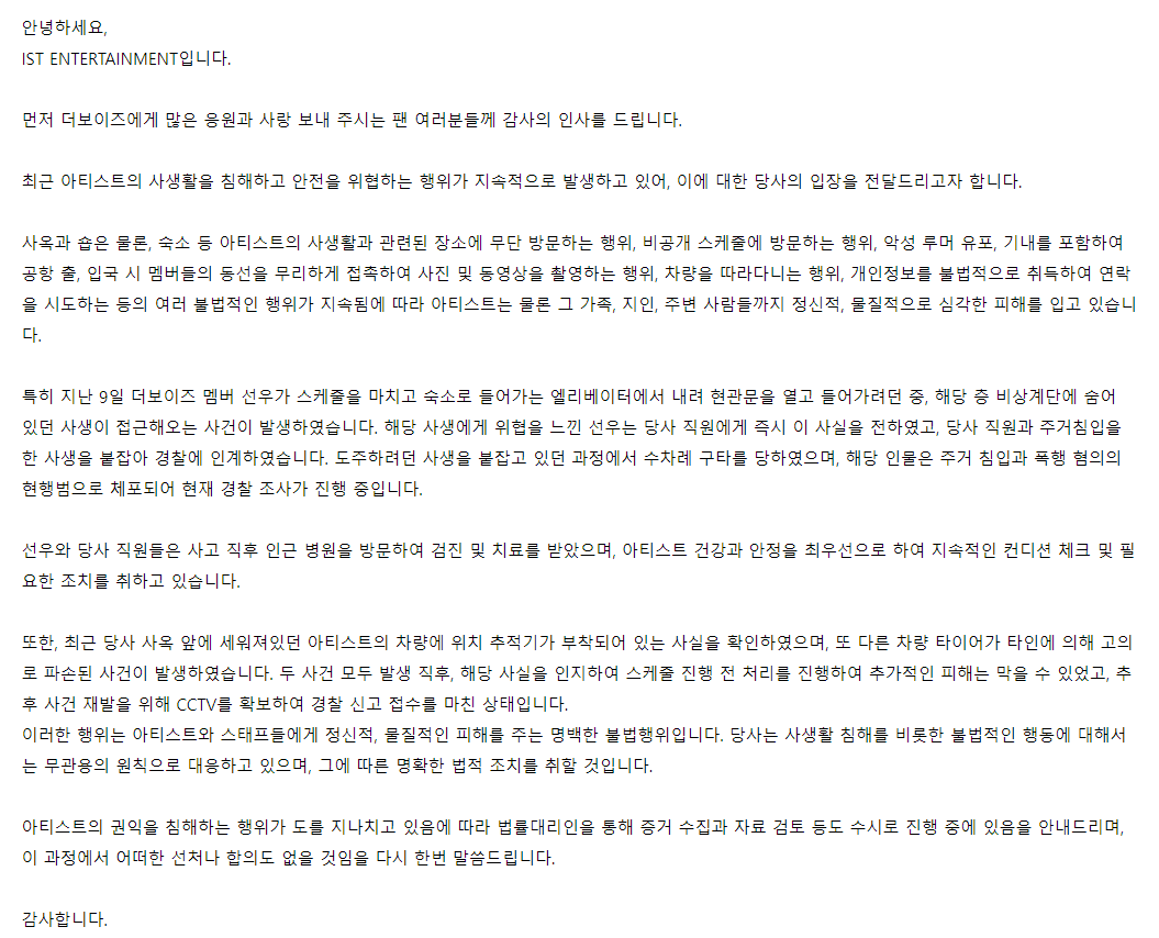 On the afternoon of the 14th, IST Entertainment posted a statement on the group’s official fan cafe, stating, “There have been continuous incidents involving the invasion of our artist’s privacy and threats to their safety.”