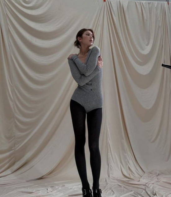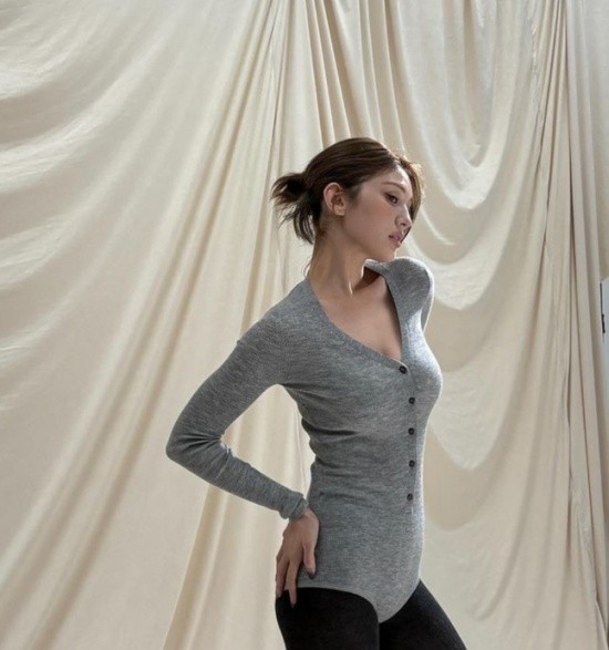 In the photos, Jeon Somi wore a form-fitting gray knit ensemble resembling a full-body suit, accentuating her flawless figure. Despite her slender frame, she exuded a mature charm with her toned yet curvaceous silhouette.