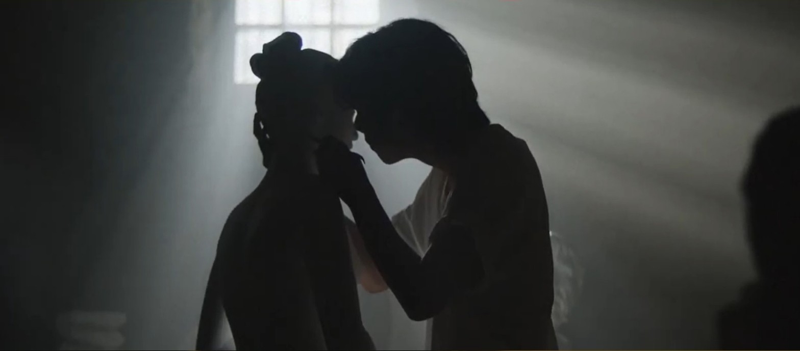 The video evokes a dreamy atmosphere. V spends time kissing a statue he sculpted, before transitioning to a moment of revelry in elaborate attire at a grand party.