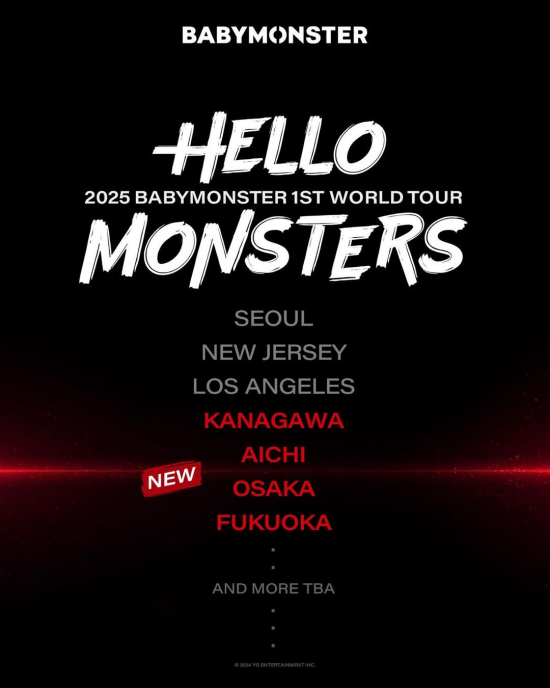 On November 25, YG Entertainment announced that BABYMONSTER will expand their world tour 'HELLO MONSTERS' with additional stops in four Japanese cities: Kanagawa, Aichi, Osaka, and Fukuoka. With this announcement, the group has solidified a tour roadmap covering major music markets in North America and Japan.