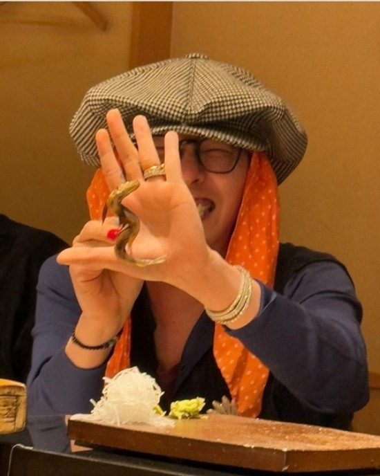 The photo, seemingly taken at an izakaya, features G-Dragon holding what appears to be a loach or eel. Striking a humorous pose as if he had caught a "dragon," he brought laughter to his fans.