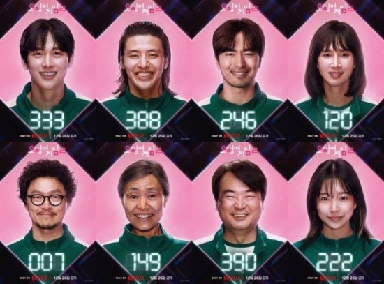 In contrast, the eight new participants display bright and hopeful expressions, filled with anticipation for the chance to win big money. The posters capture a mix of lively personalities: Yim Si-wan as Myung-ki, a cryptocurrency YouTuber (Player 333) Kang Ha-neul as Dae-ho, a cheerful and sociable contestant (Player 388) Lee Jin-uk as Kyung-seok, a desperate father seeking treatment funds for his sick daughter (Player 246) and Park Sung-hoon as Hyun-joo, a transgender woman aiming to fund her gender confirmation surgery (Player 120). Their radiant smiles amplify a paradoxical tension, contrasting with the grim nature of the game.