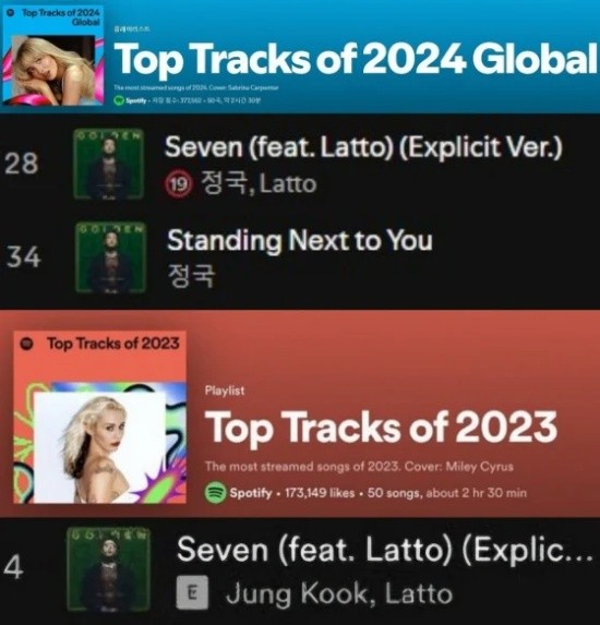 Seven, which ranked No. 4 on Spotify's Top Tracks of 2023 Global last year, continues to prove its lasting popularity by making the year-end list for the second consecutive year. This solidifies its status as a mega-hit song.