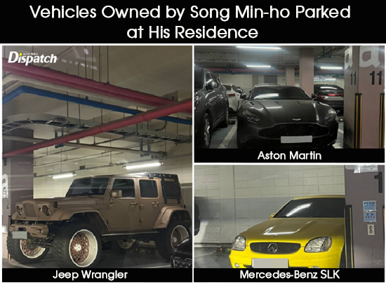 (For clarity: Song Min-ho's "regular car" is an Aston Martin, the "really nice car" is a Jeep Wrangler, and the "yellow car" is a Mercedes SLK.)