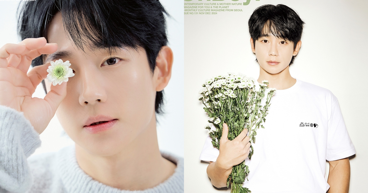 In the revealed pictorial, Jung Hae-in showcases a variety of poses using flowers, highlighting his radiant visuals even further. Additionally, he creates a cozy atmosphere by holding a puppy in his arms with a bright smile.