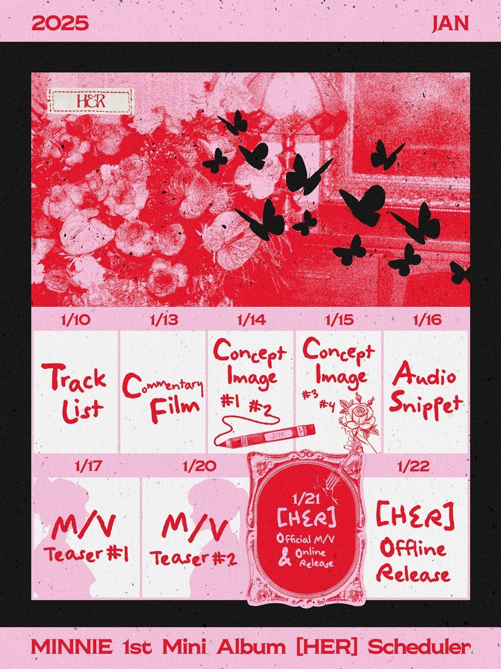 On the 9th, Cube Entertainment revealed the schedule teaser for Minnie's first solo mini album "HER" via their social media channels. The teaser features a lovely mood in red and pink tones.