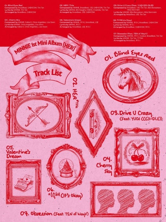 The album features a total of seven tracks, including the title song "HER", the pre-release track "Blind Eyes Red", and "Drive U Crazy" featuring fellow member Yuqi. Other tracks include "Cherry Sky", "Valentine's Dream", "It's Okay", and "Obsession" featuring Ten of WayV, offering a wide variety of genres.