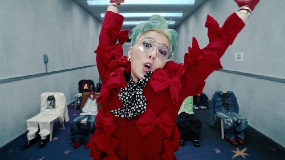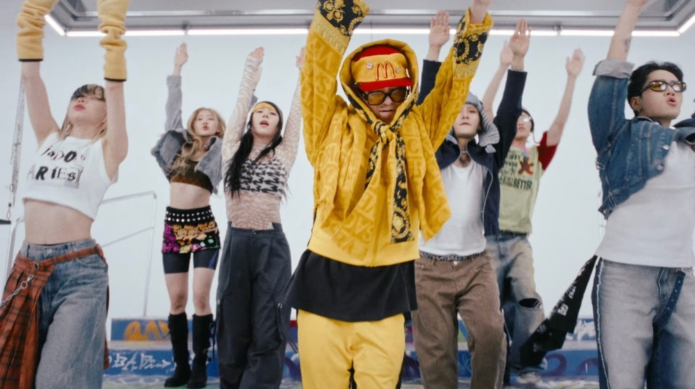 GD's fashion game is as bold as ever—sporting a mix of black jackets, red plaid, leather pants, polka-dot robes, and statement yellow prints. Each look adds to the eclectic, high-fashion vibes of the video.