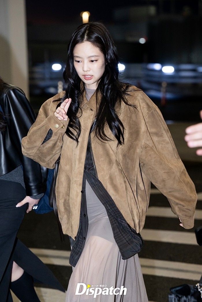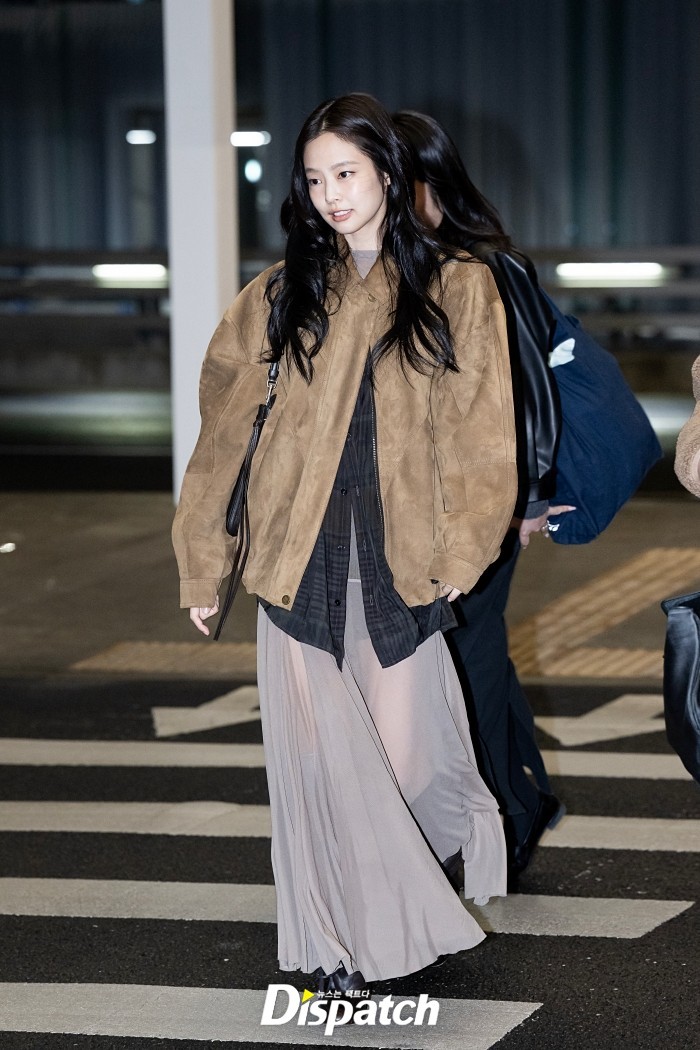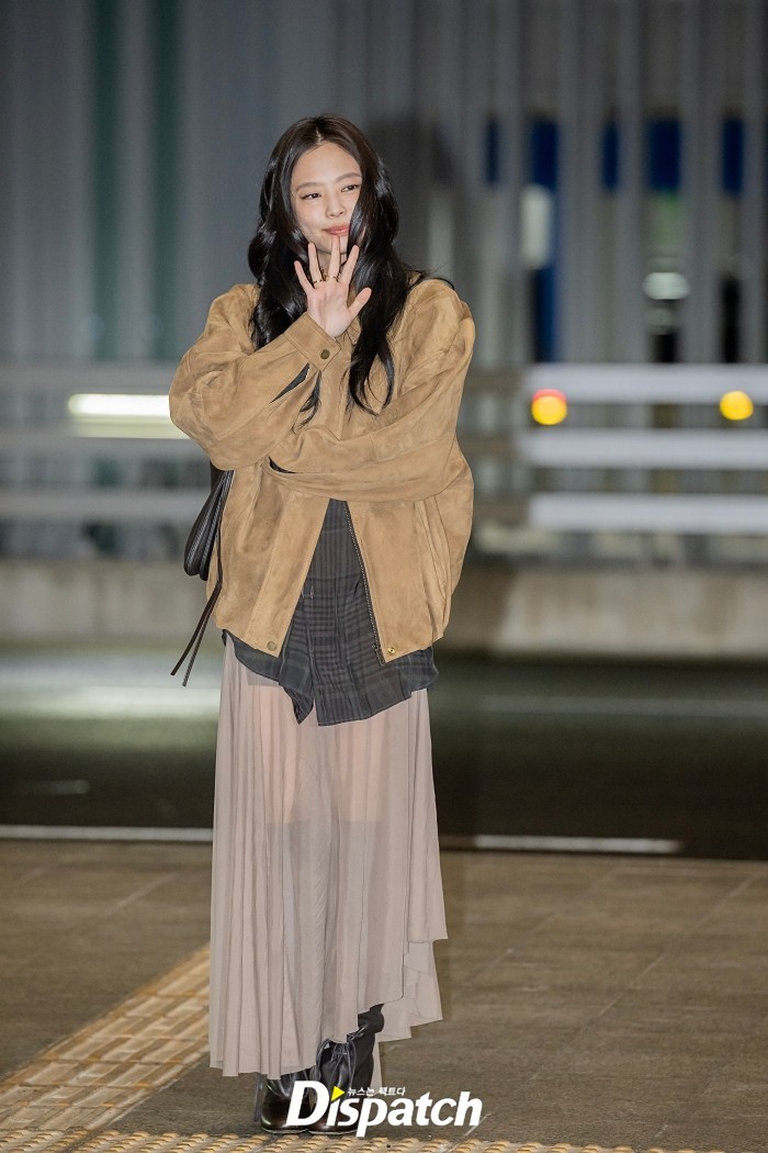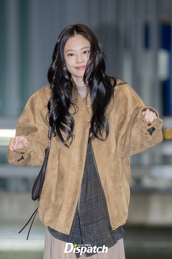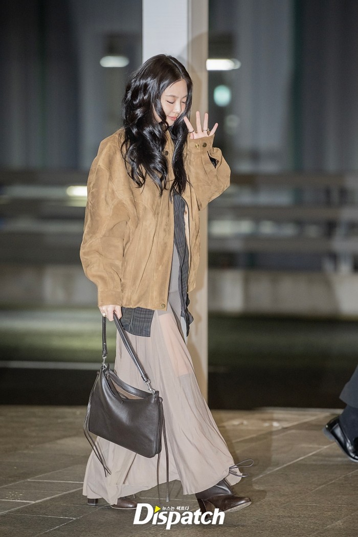 Jennie delivers yet another flawless airport look, blending retro charm with modern elegance. The mix of textures and earthy hues makes this a perfect transitional outfit for any season.