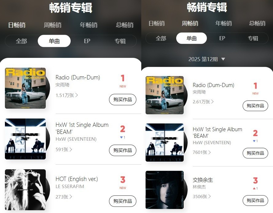 Right after its release, 'Radio (Dum-Dum)' shot straight to the top of China's biggest music platform, QQ Music. It ranked No.1 on both the daily and weekly Digital Best-Selling Albums chart (Single category).