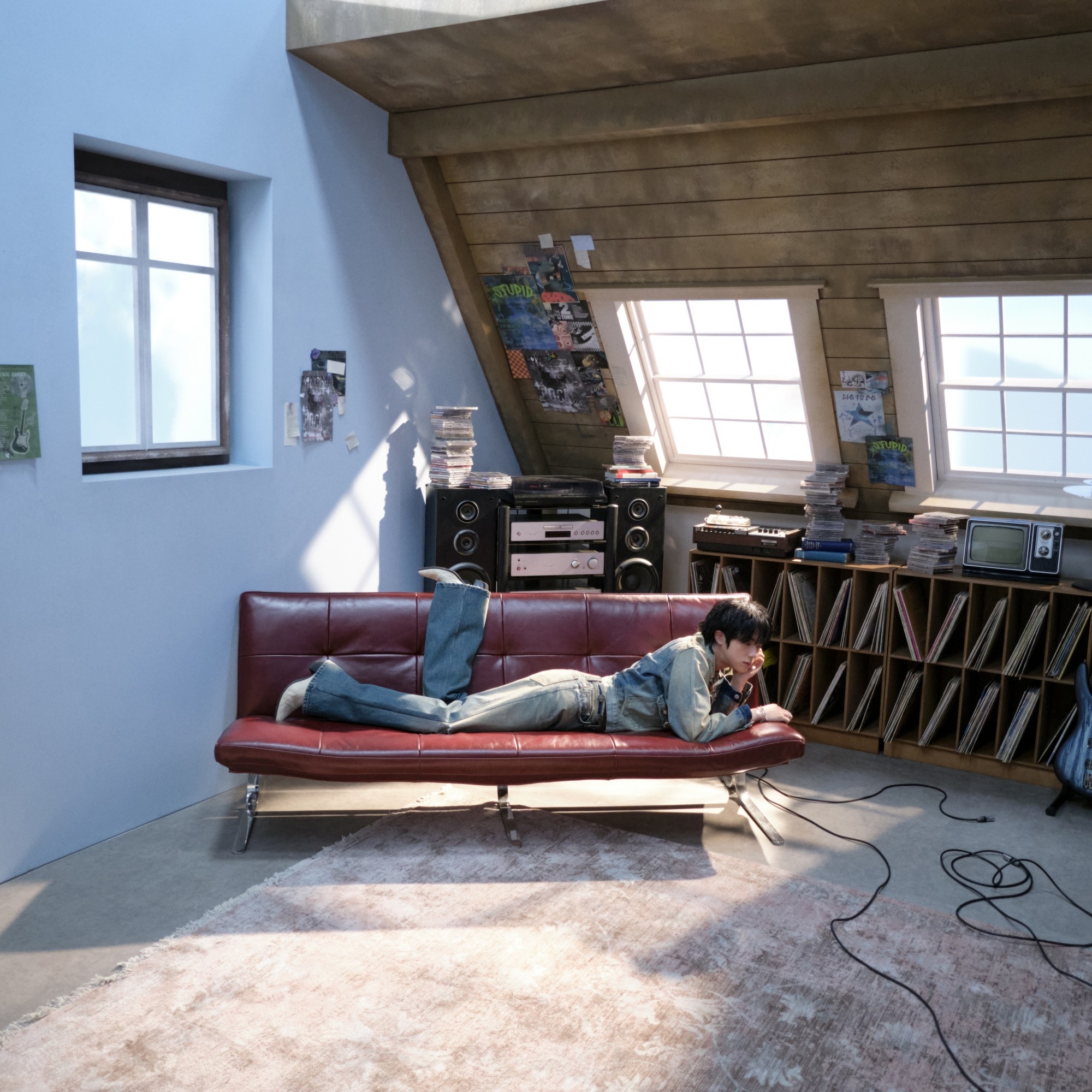 Jin appears in what looks like a retro band practice room—complete with worn-down walls, vintage posters, and classic instruments scattered around. The space gives off the energy of a musician on the cusp of creative breakthrough.