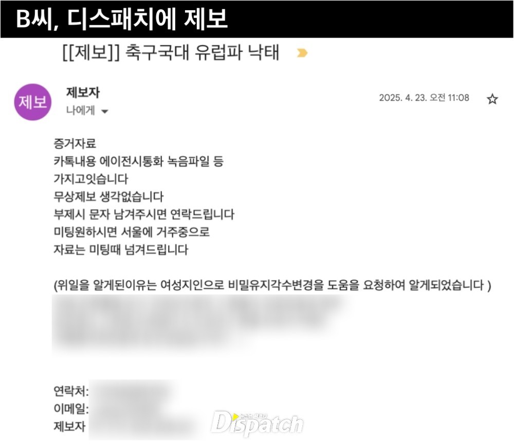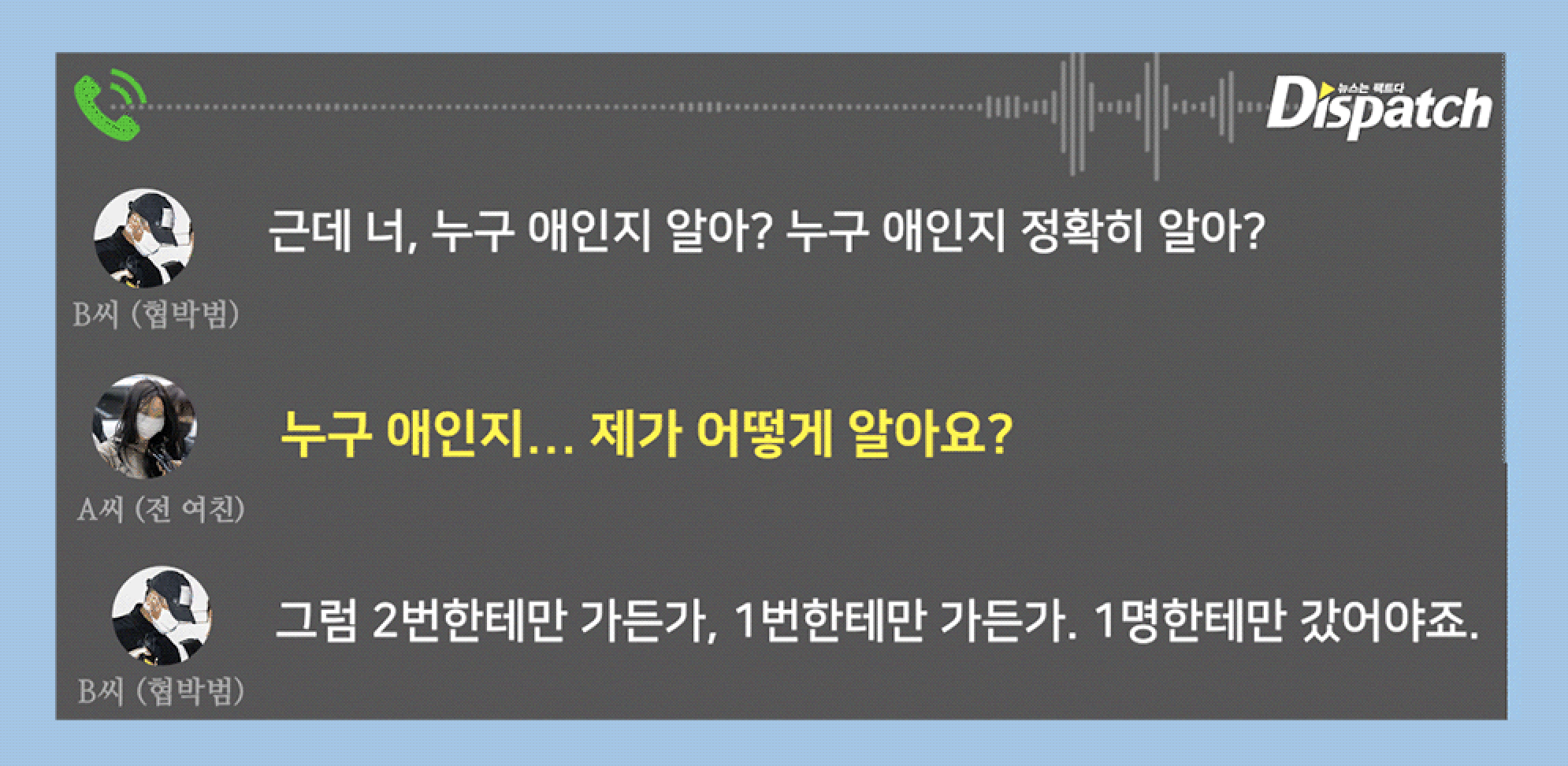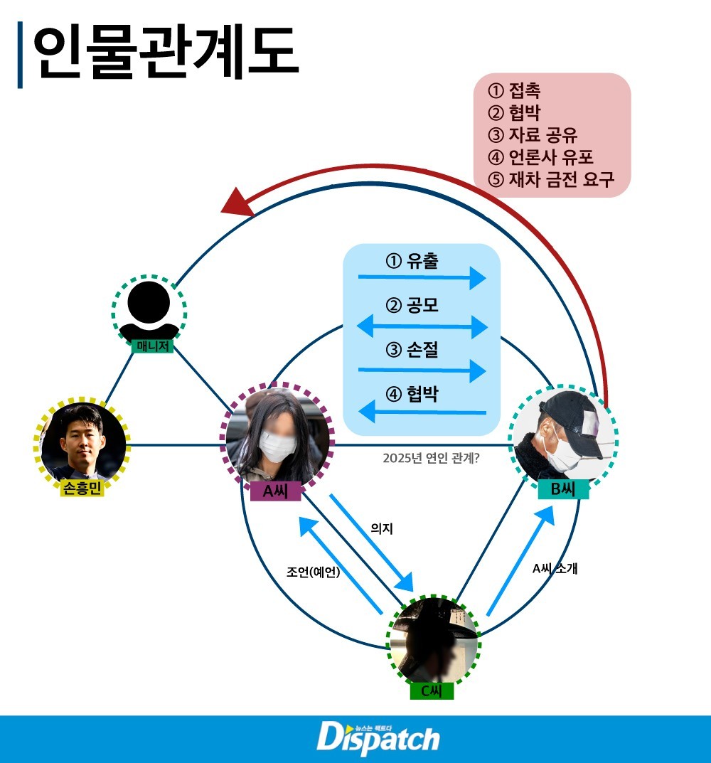 According to the audio obtained by Dispatch, A had intimate relationships with two men around the same period. In the conversation above, "Guy 1" refers to a businessman. "Guy 2" is Son Heung-min, captain of Korea's national soccer team.