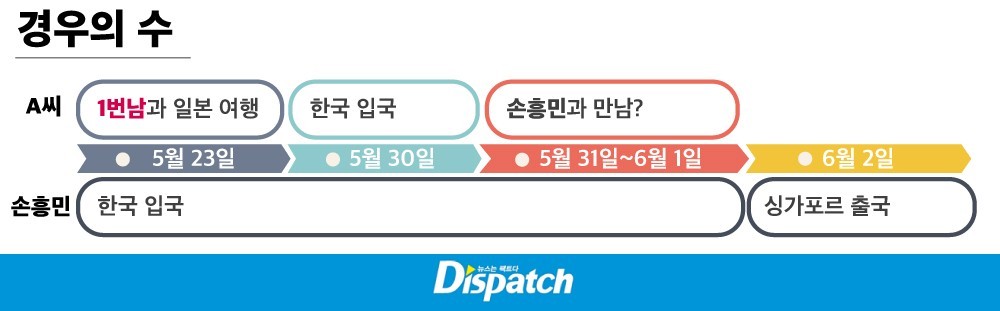 Son returned to Korea on May 23 for the World Cup Asian qualifier. At that time, A was in Japan with Guy 1. She came back to Korea on May 30 and contacted Son. The two had time to meet between May 31 and June 1. Son flew to Singapore on June 2.
