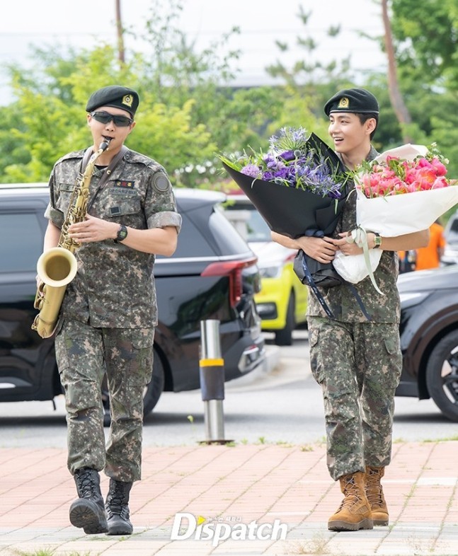 The two made their appearance at a gym in Chuncheon. RM surprised everyone by playing the Detective Conan theme song on the tenor saxophone, before both gave a respectful military salute and shouted, "Chungseong!" (Loyalty!).