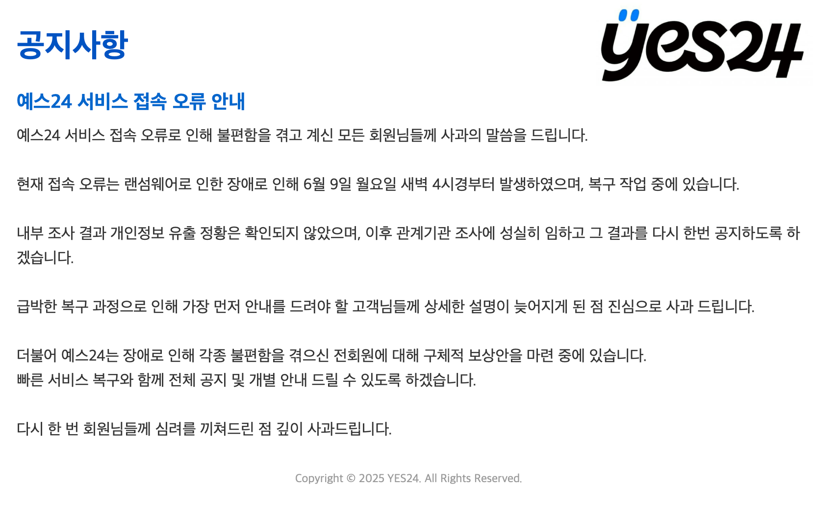 Since June 9, YES24 has been inaccessible due to a system-wide failure. As of June 10, the site remains down. The company released an official statement explaining the situation.