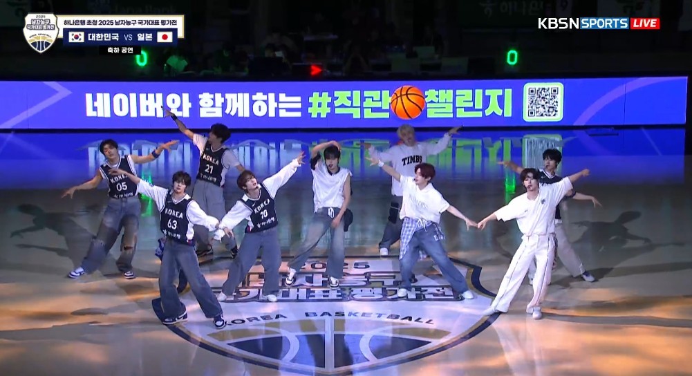 ZEROBASEONE made a surprise appearance at the halftime show of the 2025 Korea Men's National Basketball Friendly Match held at Anyang Jeong Kwan Jang Arena.