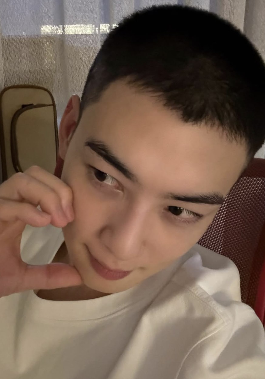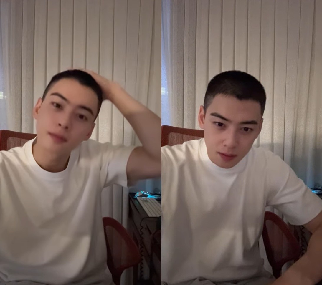 On July 27, the day before enlistment, Cha Eun-woo greeted fans via a YouTube live stream. Sporting a freshly cropped haircut, he said, "I cut my hair like this. I'll stay healthy and come back safely."