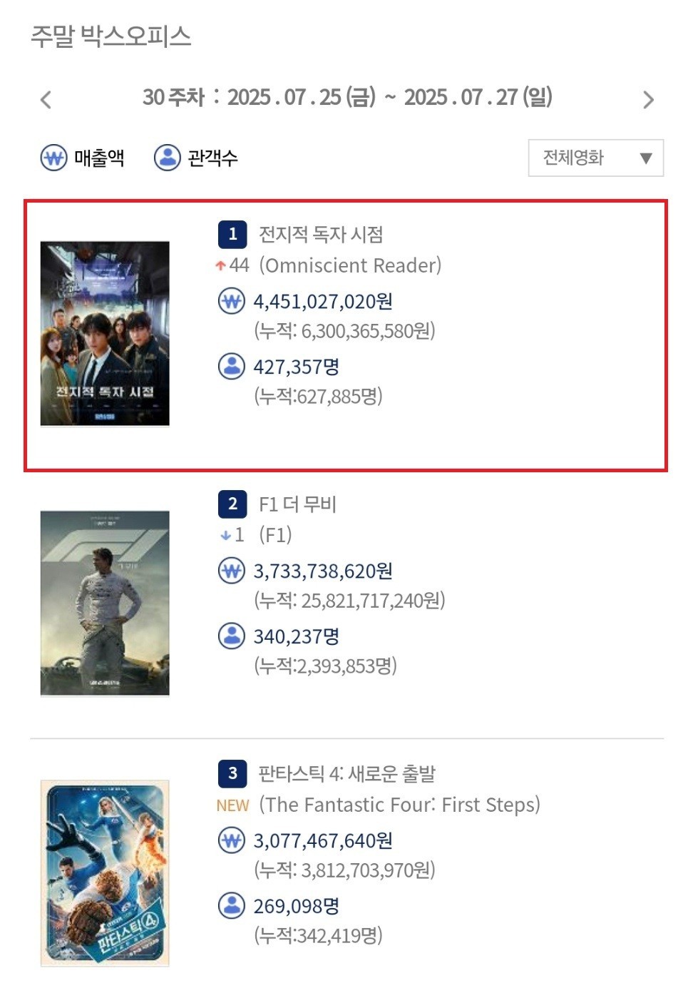 According to the Korean Film Council's integrated ticketing system, Omniscient Reader drew 427,362 viewers over its first weekend (July 25–27). Since premiering on July 23, it has maintained the top spot for five days in a row, bringing its total admissions to 627,890.