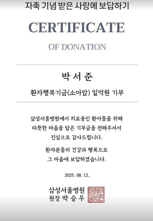 Samsung Medical Center expressed gratitude, saying, "We truly appreciate the heartfelt donation for the children. We will repay your kindness by working toward the patients' health and happiness."