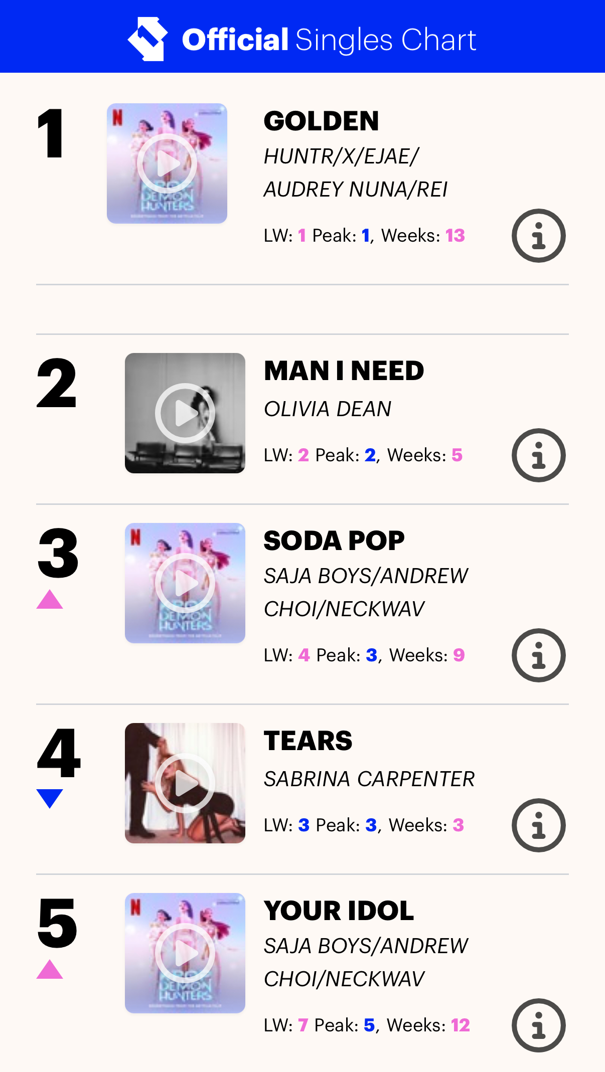 Other K-Pop Demon Hunters OST tracks are also charting high. Boy group Saja Boys placed with Soda Pop at No.3 and Your Idol at No.5, while Take Down landed at No.24.