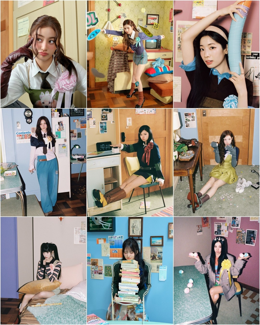 The members showcased witty and lighthearted looks, preparing for a "talent show" in honor of their 10th year. Each member posed with quirky props and playful expressions. In the group photo, the members sat together wearing party hats, surrounded by scattered party decorations that added to the festive atmosphere.