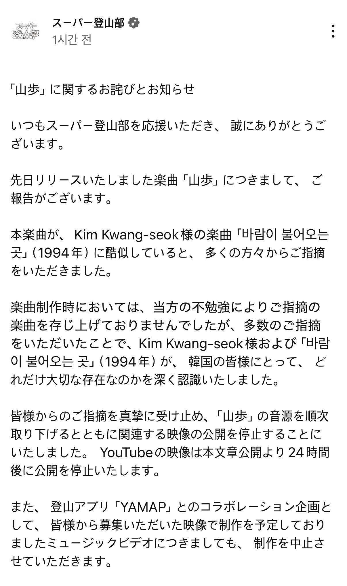 Japanese indie band Super Mountaineers has officially acknowledged similarities between their music and the late Kim Kwang-seok's beloved classic, deciding to halt activities in response to the controversy.