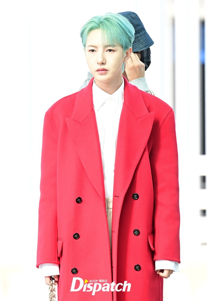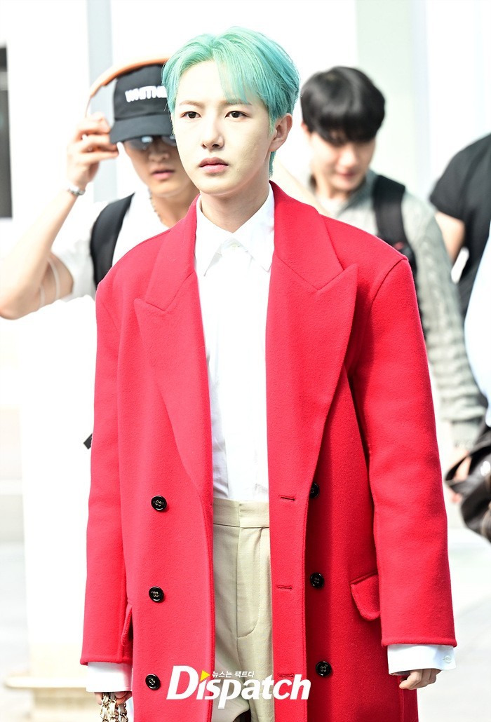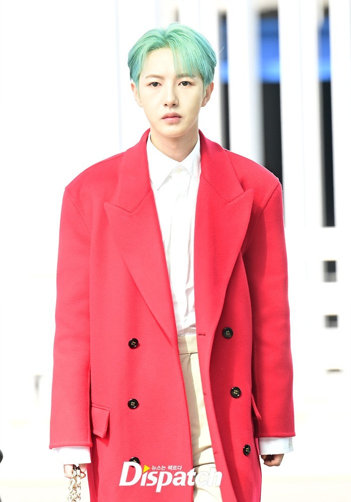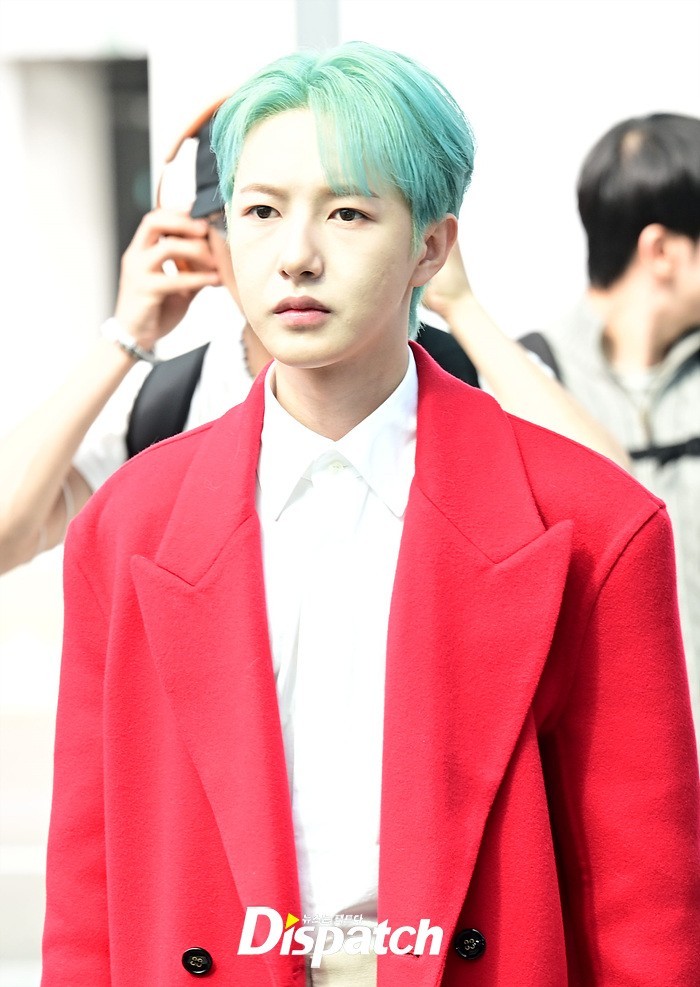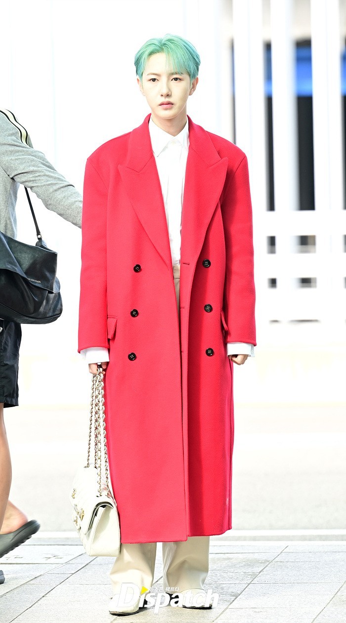 He captured attention with a look straight out of a romance comic — mint-colored hair paired with a vivid red coat that highlighted his bright, youthful aura. The bold color contrast created a striking visual harmony, showcasing his fearless yet refined sense of style.