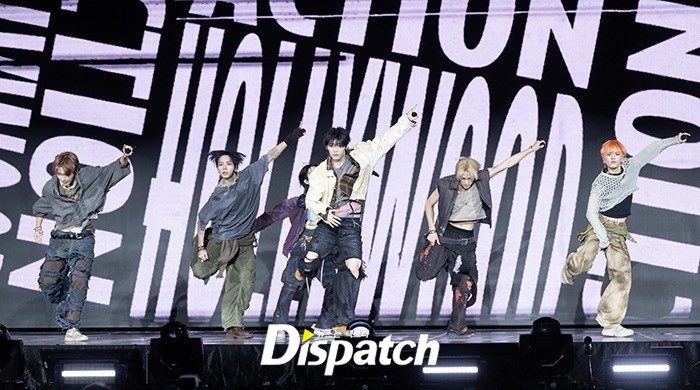 Their performance matched the song's cinematic tone — synchronized choreography with powerful group dynamics, including a playful "clapperboard" motion inspired by movie directors. The lyrics capture the group's witty confidence: 'Instead of a fancy red carpet, roll out the mat — we can do anything.'