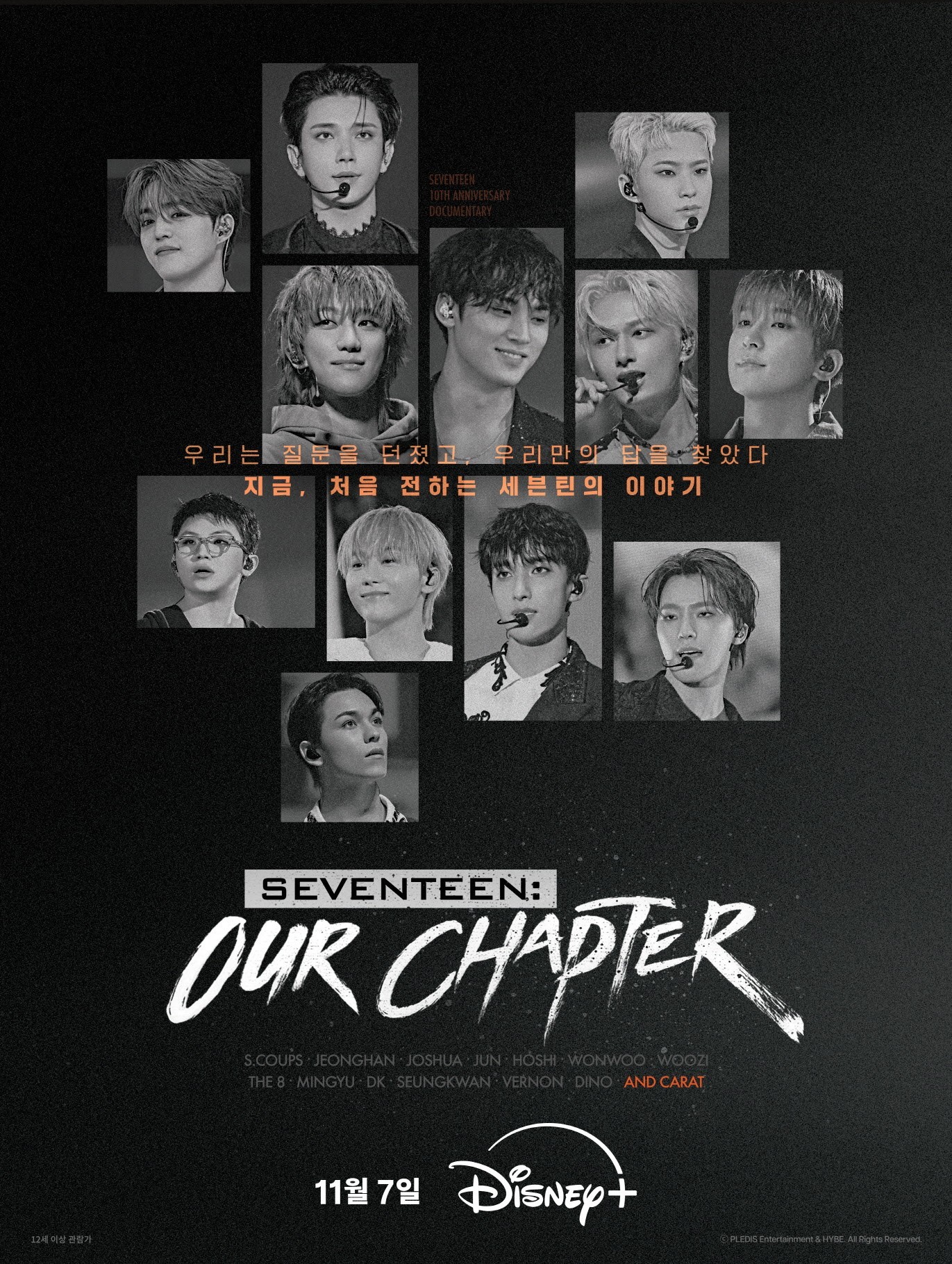 Pledis Entertainment announced on October 23 that the series SEVENTEEN: OUR CHAPTER will premiere on November 7. The main poster captures the group's dynamic stage moments — from bright smiles to focused gazes — expressing both gratitude and sincerity toward fans.