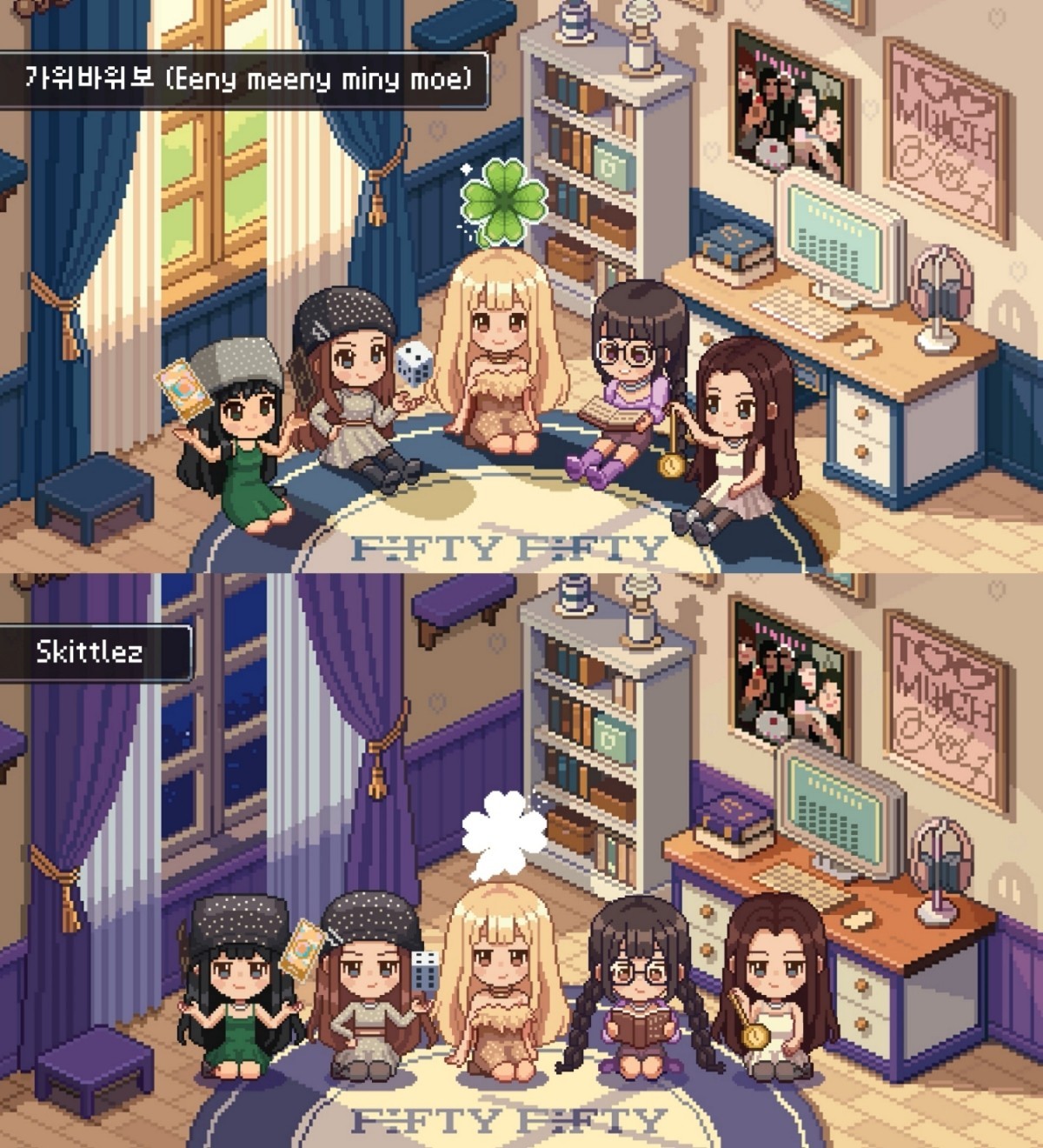 A new challenge also awaits: the B-side "Skittlez" marks FIFTY FIFTY's first attempt at the hip-hop genre, signaling an expanded musical spectrum. The highlight video stands out with its retro 8-bit pixel art concept, turning the members into game-style characters holding items like dice, clovers, and pocket watches—objects that hint at ties to the new songs.