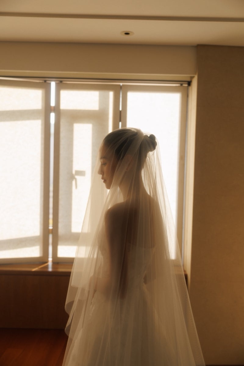 In the photos, Kim radiates elegance in a pure white wedding gown, wearing a translucent veil and a neatly styled updo that highlights her graceful profile.