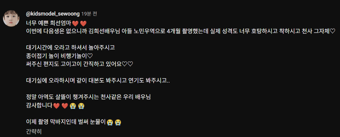 Her warmth off-camera was also highlighted by a heartfelt comment from the mother of child actor Jo Se Woong, who plays her son in No Next Life. "She's truly an angel," the mother wrote. "She played with my child during breaks, helped with his acting, and even wrote him a handwritten letter."