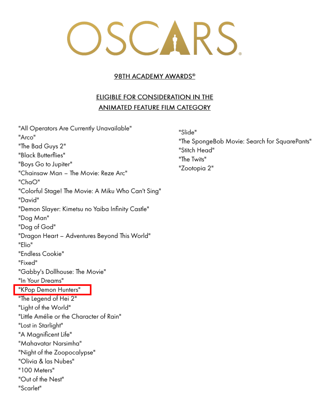 On November 21 (local time), the Academy of Motion Picture Arts and Sciences (AMPAS) revealed the list of eligible films for Best Animated Feature at the 98th Academy Awards. A total of 35 titles were submitted for consideration.