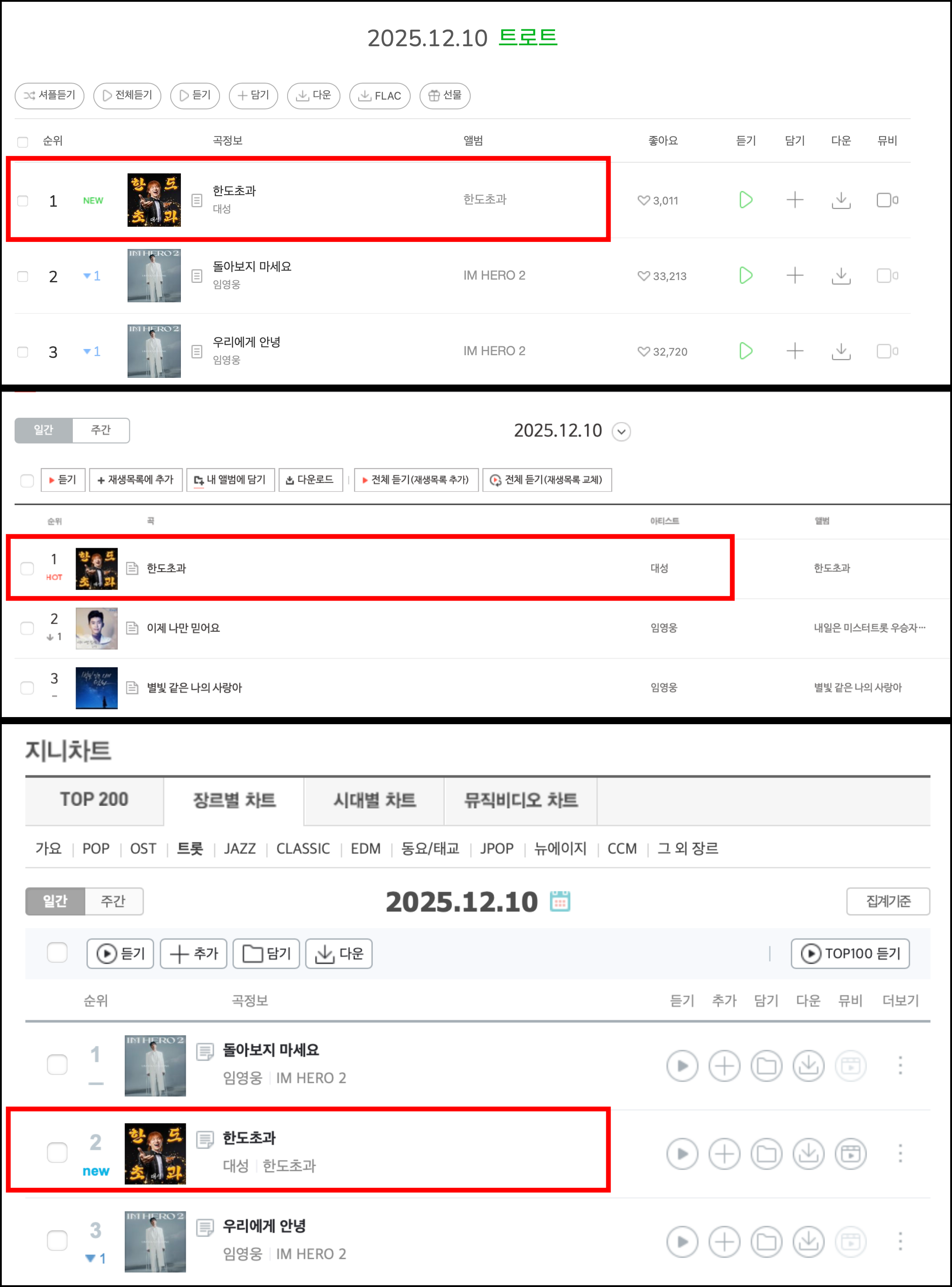 The response was explosive. On release day, the track topped two of Korea's major trot charts—Melon and Bugs—surpassing longtime chart leader Lim Young Woong. It also ranked No.2 on Genie's trot chart.
