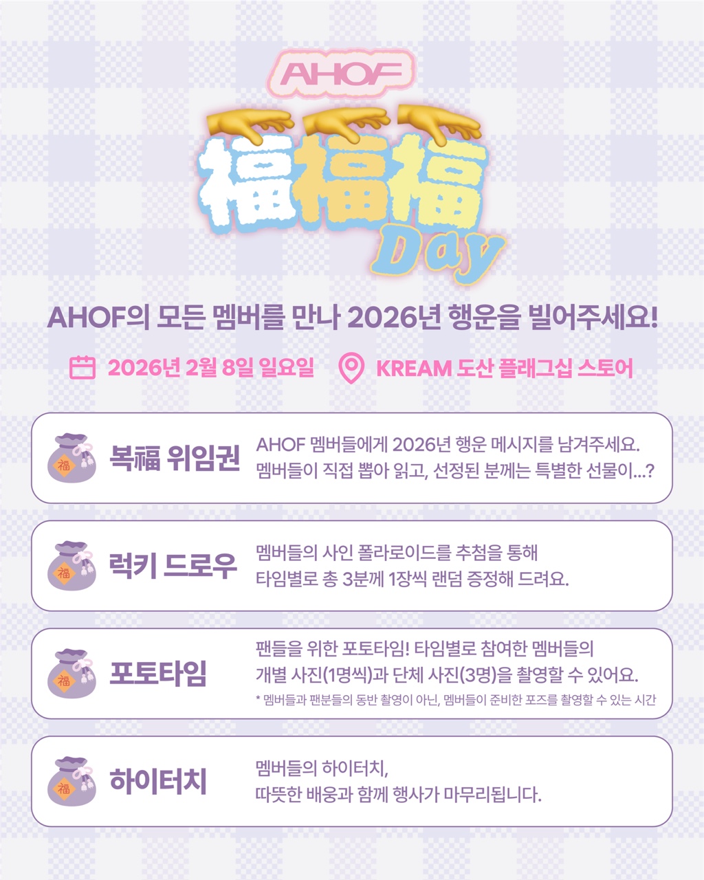 On February 8, from 1 p.m. to 4 p.m., AHOF will host "AHOF 福福福 Day" at KREAM's Dosan flagship store in Sinsa-dong, Gangnam, Seoul. The event marks the launch of the group's idol trading cards, miimca, and offers fans a rare, close-up fan meeting experience.
