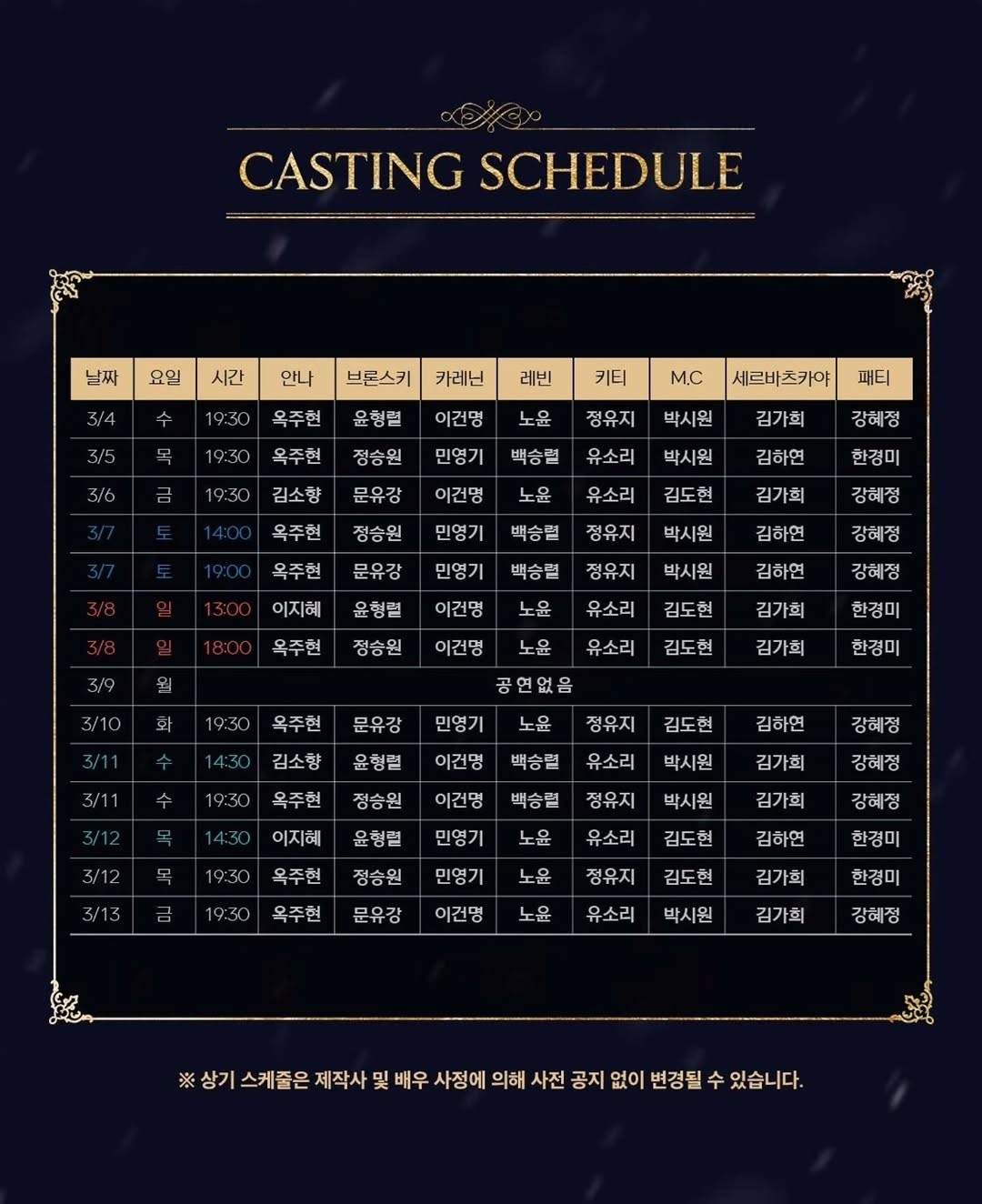 According to the production's recently released schedule, the role of Anna is triple-cast with Ock Joo Hyun, Lee Ji Hye, and Kim So Hyang. However, the allocation of performances has sparked debate. Out of 38 total shows, Ock Joo Hyun is scheduled for 23 performances—over 60 percent—while Lee Ji Hye will appear in 8 and Kim So Hyang in 7.